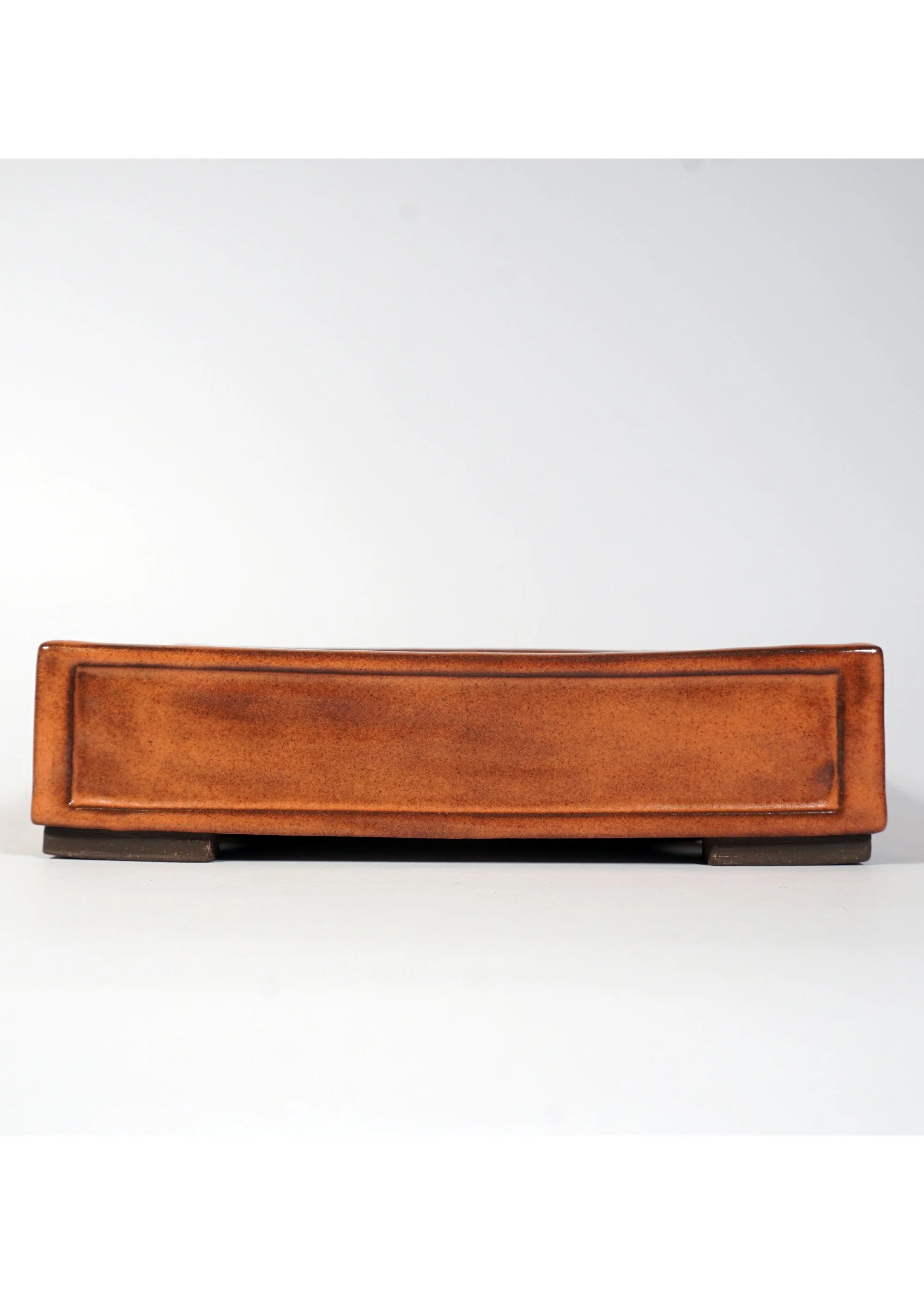 A unique hand built square pot with a honeycomb pattern carve out. Orange and cream colour accents with a top lip.